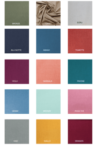 - colori nella seconda foto: Kaki (ricamo "Bosco") / Ruggine (fuori produzione, abbiamo il Tomette ora) / Rosa The (ricamo "Gabriela") / Camel (ricamo "Lola") / Bronze (ricamo "Matias") / Pavone (ricamo "Daniel")